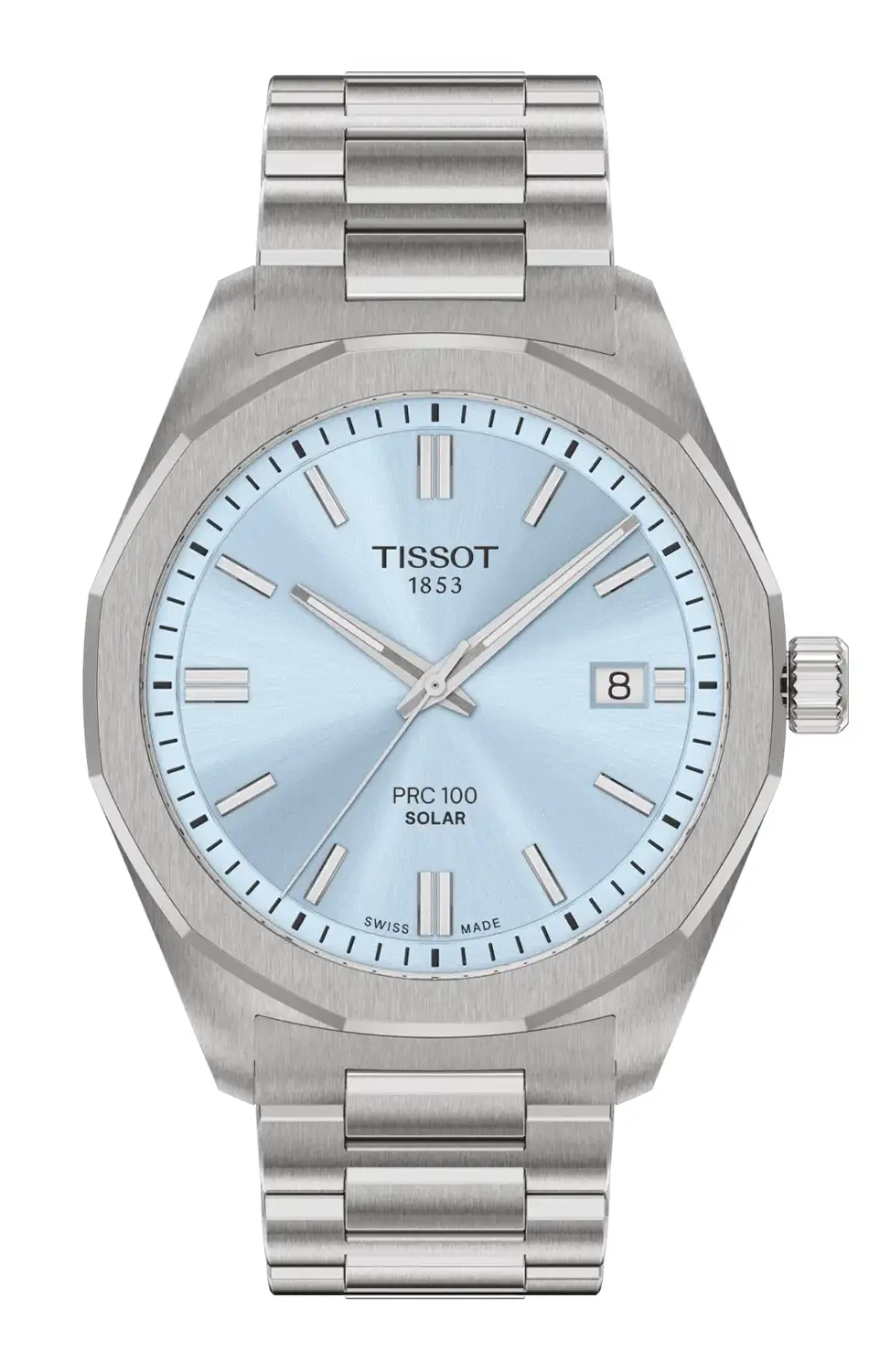 Srdcem hodinek je moderní solární mechanismus s technologií Lightmaster Solar, který čerpá energii ze světla. Místo tradiční baterie je zde použit akumulátor, který se nabíjí jak slunečním, tak umělým světlem – stačí každodenní vystavení jakémukoli zdroji světla, aby hodinky nepřetržitě fungovaly. Plné nabití mechanismu umožňuje chod hodinek po mnoho týdnů, a když se úroveň energie blíží vybití, speciální indikátor End Of Energy (E.O.E.) na to upozorní. Tato funkce signalizuje nízký stav nabití například skokovým pohybem sekundové ručičky, čímž diskrétně informuje, že je čas hodinky opět vystavit světlu. Číselník hodinek Tissot PRC 100 Solar Quartz je navržen tak, aby efektivně propouštěl světelné paprsky k solárním panelům a zároveň okouzloval propracovaným designem. Má přehledné hodinové indexy a elegantně tvarované ručičky pokryté luminiscenční vrstvou Super-LumiNova®, což umožňuje čtení času i ve tmě. Na číselníku je také praktický datumovka, která je diskrétně zakomponována do designu. Dále se zde nachází logo Tissot a nápis "Solar" pod názvem kolekce PRC 100, které jemně zdůrazňují přítomnost moderní technologie v klasické podobě hodinek.