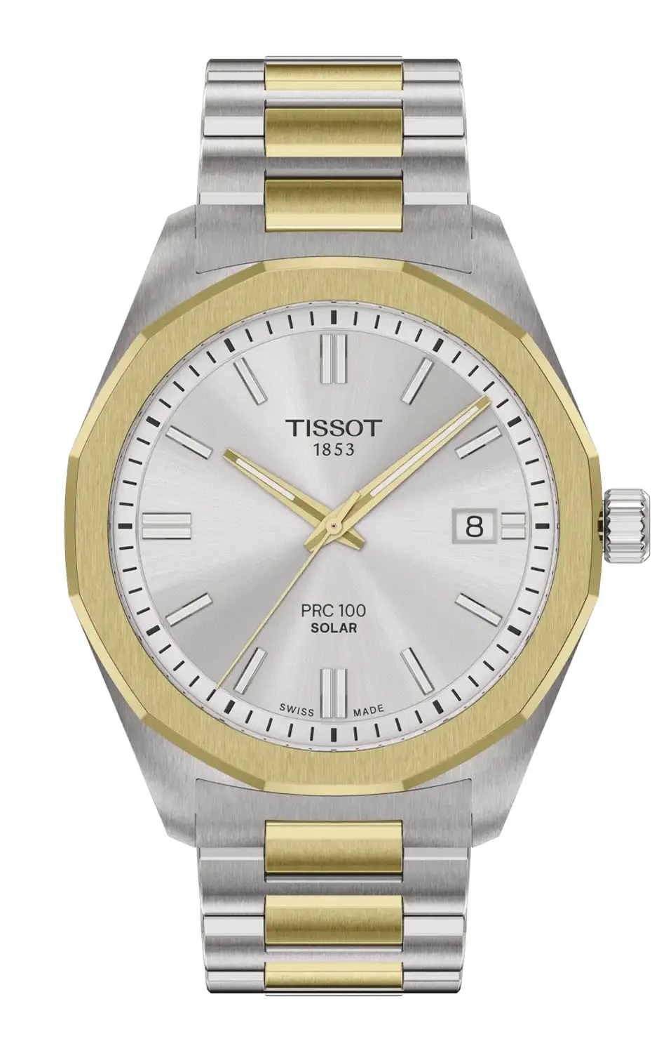 Srdcem hodinek je moderní solární strojek s technologií Lightmaster Solar, který čerpá energii ze světla. Technologie Lightmaster Solar využívá pokročilé fotovoltaické články, plynule integrované pod safírovým sklíčkem. Namísto tradiční baterie je zde použit akumulátor, který se nabíjí jak slunečním, tak i umělým světlem – postačí každodenní vystavení jakémukoli zdroji světla, aby časomíra fungovala nepřetržitě. Plné nabití strojku umožňuje provoz hodinek po mnoho týdnů a když se úroveň energie blíží vyčerpání, speciální indikátor End Of Energy (E.O.E.) na to upozorní. Tato funkce signalizuje nízký stav energie například skokovým pohybem sekundové ručky a diskrétně informuje, že nastal čas hodinky znovu dobít světlem. Ciferník hodinek Tissot PRC 100 Solar Quartz byl navržen tak, aby efektivně propouštěl světelné paprsky k solárním panelům a zároveň zaujal propracovaným vzhledem. Disponuje přehlednými hodinovými indexy a elegantně tvarovanými pozlacenými ručkami potaženými luminiscenční vrstvou Super-LumiNova®, což umožňuje odečet času i ve tmě. Na ciferníku je rovněž umístěno praktické datumové okénko, decentně zakomponované do designu. Na ciferníku se nachází také logo Tissot a nápis „Solar“ pod názvem kolekce PRC 100, které nenápadně zdůrazňují přítomnost moderní technologie v klasické podobě hodinek.