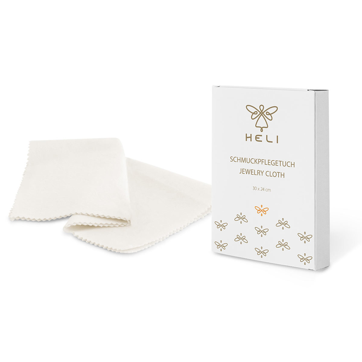 Heli hadřík pro péči o šperky 113042. Čistí a leští zlaté, stříbrné a ocelové šperky a dodává jim nový vysoký lesk. V případě silně zašlých šperků jednoduše navlhčete roh hadříku a skvrnu setřete. Poté ji vyleštěte suchou částí. Utěrka obsahuje 5 % mýdla, proto by se neměla prát, protože ztratí své pečující vlastnosti. Rozměry 30 × 24 cm.