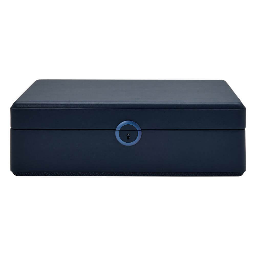 Krabička na 5 hodinek WOLF Earth Limited Edition 190917 je více než elegantní doplněk - je manifestem moderního luxusu s šetrností k životnímu prostředí. Vyrobeno z inovativní jablečné kůže, zaujme nejen svým jedinečným designem, ale také ekologickým poselstvím. Veganská kůže je měkká na dotek a odolná a její hluboký, půlnoční modrý odstín vyzařuje sofistikovanost. Decentní matné kování a zámek s klíčem zdůrazňují smysl pro detail a dodávají celku moderní eleganci. Vnitřek boxu je zakončen kvalitním recyklovaným saténovým žakárem, který mu dodává lehkost a noblesu. Hodinky jsou umístěny na speciálních polštářcích a jejich inovativní design zabraňuje poškrábání náramků a chrání každý prvek hodinek jako v luxusním trezoru.