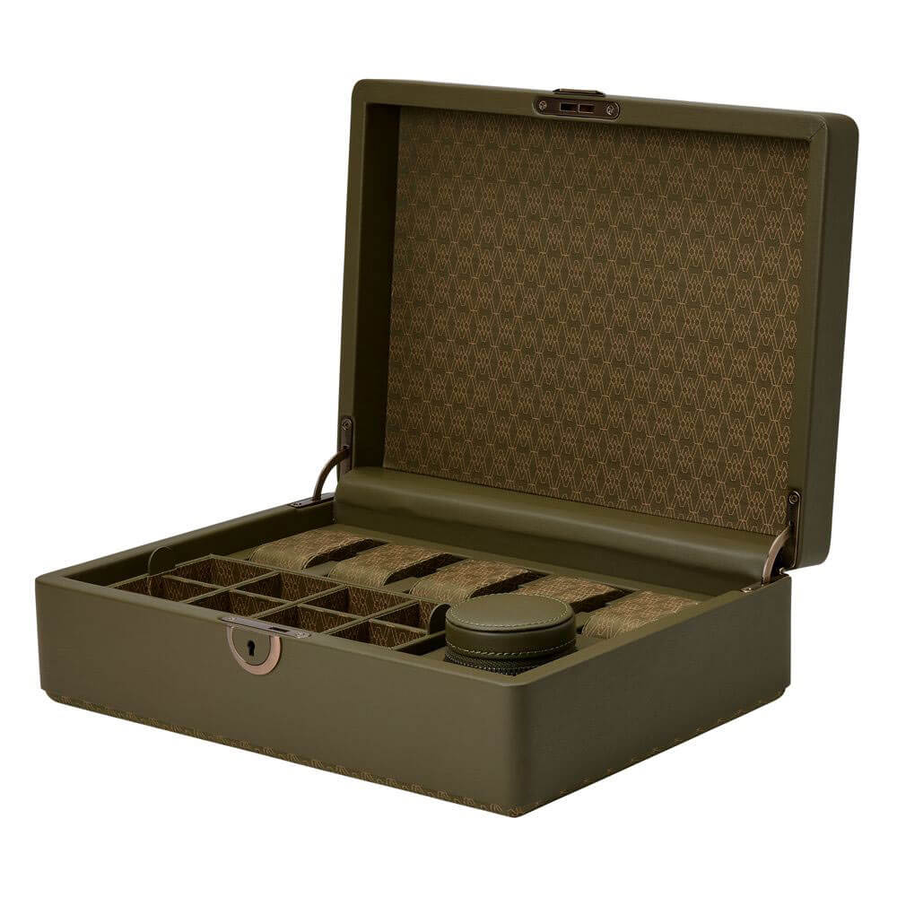 Krabička na 5 hodinek WOLF Earth Limited Edition 190941 je více než elegantní doplněk - je manifestem moderního luxusu s šetrností k životnímu prostředí. Vyrobeno z inovativní jablečné kůže, zaujme nejen svým jedinečným designem, ale také ekologickým poselstvím. Veganská kůže je měkká na dotek a odolná a její hluboký olivově zelený odstín vyzařuje sofistikovanost. Decentní matné kování a zámek s klíčem zdůrazňují smysl pro detail a dodávají celku moderní eleganci. Vnitřek boxu je zakončen kvalitním recyklovaným saténovým žakárem, který mu dodává lehkost a noblesu. Hodinky jsou umístěny na speciálních polštářcích a jejich inovativní design zabraňuje poškrábání náramků a chrání každý prvek hodinek jako v luxusním trezoru.