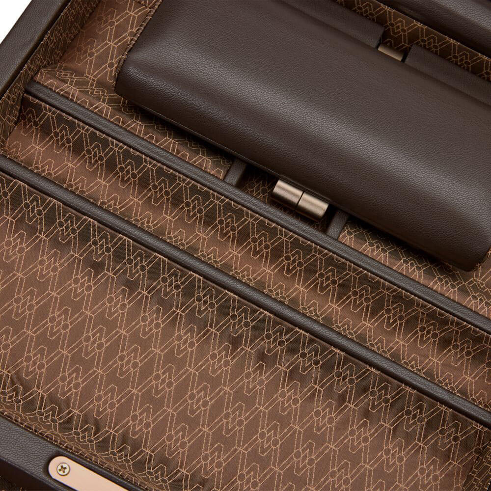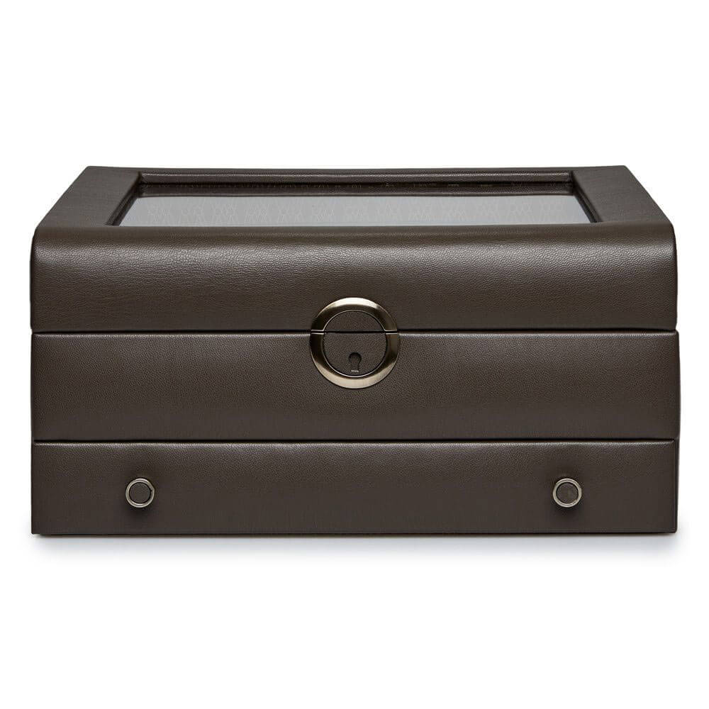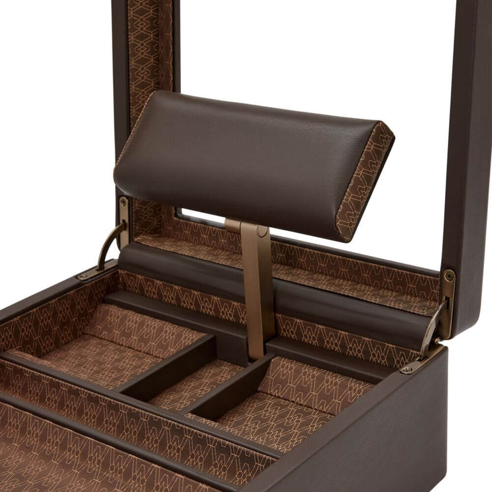 Box WOLF Earth Limited Edition 190706 je luxusní organizér, která představuje harmonické spojení elegance, funkčnosti a moderního přístupu k designu. Vyrobená z výjimečné veganské jablečné kůže v hnědé barvě Wolf Coffee Edition ohromuje jak svou estetikou, tak i odolností. Její provedení, v podobě žakárové saténové podšívky, dodává vnitřku jemný lesk a dokonale podtrhuje její vytříbený charakter. Uvnitř se nachází speciálně navržený rozkládací stojan na dvě hodinky, který dokonale vystavuje a chrání cennou sbírku. Prosklené víko umožňuje rychlý náhled na obsah, což není jen praktické, ale také umožňuje obdivovat sbírku bez nutnosti otevírání krabičky. Zámek na klíč zajišťuje dodatečnou bezpečnost, díky čemuž jsou nejcennější předměty náležitě chráněny.